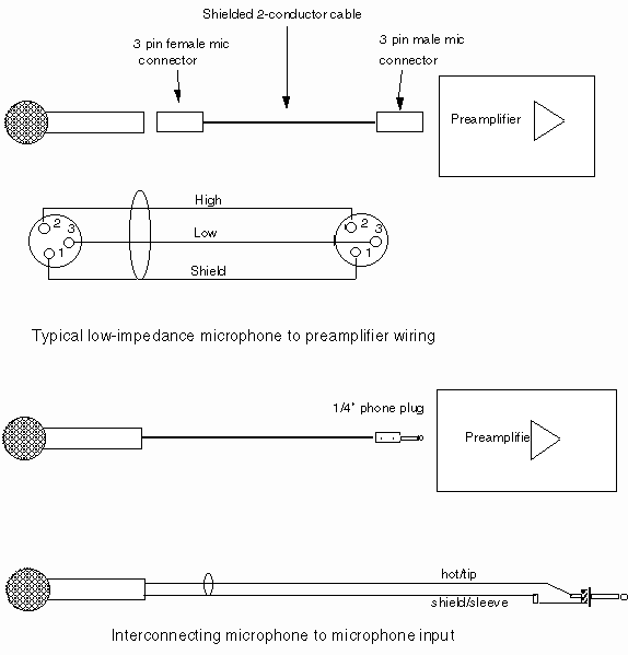 BALANCED/UNBALANCED These terms are used when describing the configuration of the microphone input, output and wiring. A balanced configuration typically has three conductors. One is the shield or screen which surrounds the other two wires. An unbalanced system uses two conductors. One is the shield or screen and the other conductor is inside. In the balanced configuration the shield is connected to an appropriate ground and is used solely to protect the signal carrying conductors from outside interference. When noise does make it through the shield it is impressed on the signal carrying conductors in the same amount and direction. When connected to a balanced input, with one side being the negative of the other, this noise is canceled. With an unbalanced line the shield also carries signal. If noise makes it through the shield to the inner conductor it will be added to the desired signal. See Figure 10.